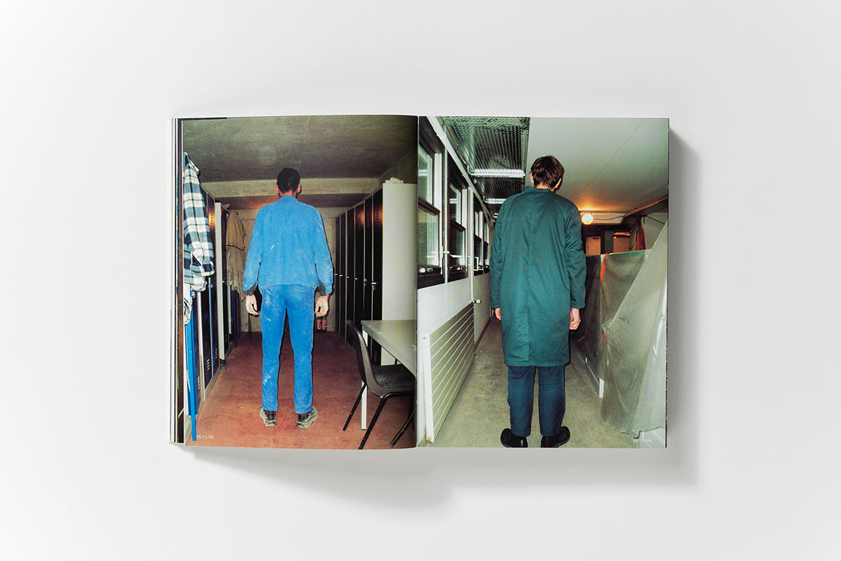Pendant près de trois ans, Arnaud Théval a suivi la réhabilitation des Archives départementales de Loire-Atlantique. L’artiste a régulièrement visité le chantier pour rencontrer le personnel et les ouvriers, leur proposant au passage de les photographier de dos, tournés vers leur espace de travail. Ces photographies sont accompagnées de notions écrites par un critique d’art et un ethnologue, questionnant la représentation des corps à travers l’histoire de l’art, ou mettant en lumière le travail des archivistes. En l’absence d’un sommaire et des numéros de page (remplacés par les dates de prise de vue de chaque photo), le livre invite à se perdre dans ce dédale de portraits et de notes, et à pénétrer un lieu habituellement clos, pour saisir, au plus près des corps et de l’activité intense qui y règne, les particularités de deux univers en mouvement.